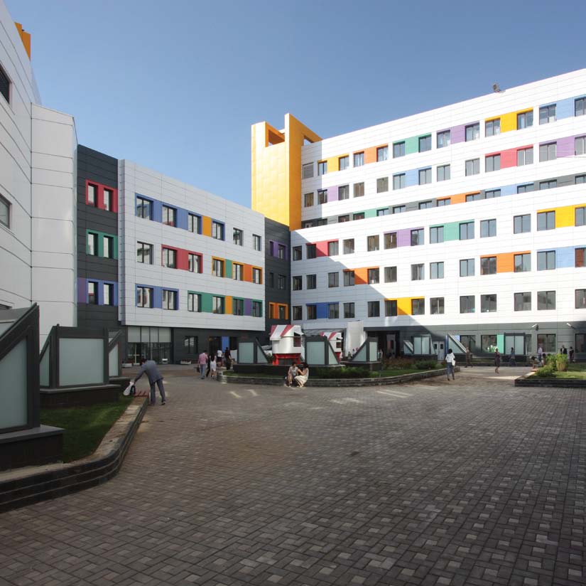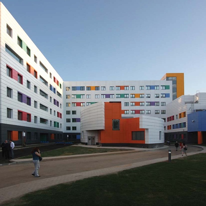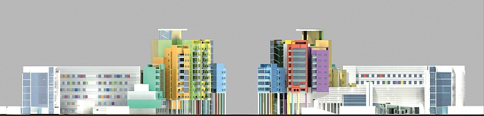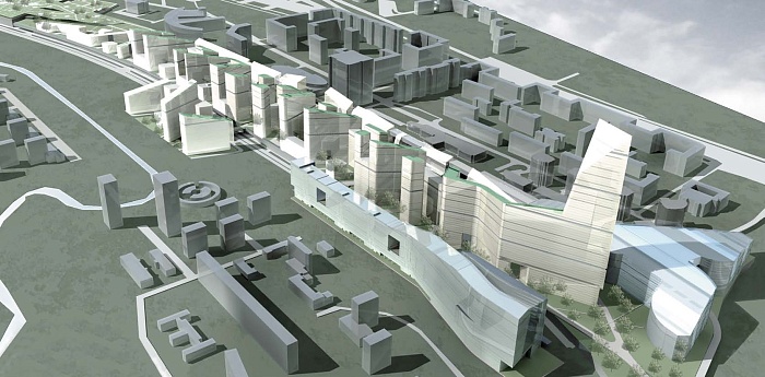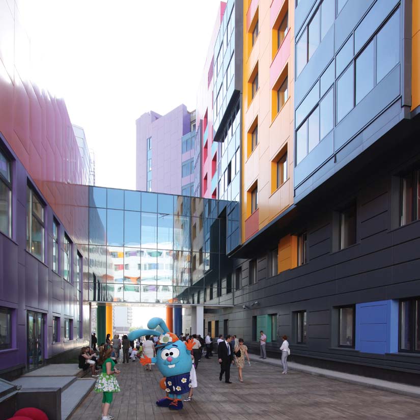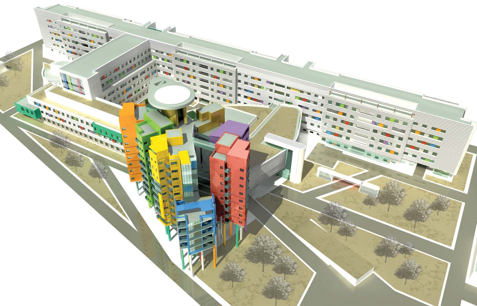 М. М. Посохину как автору и руководителю авторского коллектива при проектировании такого серьезного медицинского учреждения удалось решить важнейшие задачи: организовать комплекс в моноблоке — единой системе взаимосвязанных объектов переменной этажности; создать максимально компактную схему комплекса, позволяющую сбалансировать большие строительные объемы и многообразие функциональный связей; минимизировать воздействие на комплекс, особенно на подразделения детского стационара, близлежащей крупной транспортной магистрали; обеспечить наиболее эргономичные связи и подъезды ко всем блокам центрального корпуса и вспомогательным зданиям комплекса.